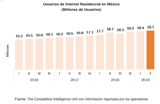 | Durante los últimos años, el acceso a banda ancha de Internet ha crecido significativamente en México. De esta manera, al final de 2018, 76% de los mexicanos mayores de 6 años son considerados usuarios regulares de internet. Estos niveles de adopción son atribuibles, en lo principal, al incremento en el acceso a tecnología móvil, tal que el crecimiento en la penetración de smartphones y la agresiva oferta de datos móviles por parte de los operadores celulares ha permitido que se contabilicen 89 millones de accesos a Banda Ancha Móvil (BAM) al segundo trimestre de 2019 (2T19). Asimismo, se registra un aumento exponencial en el consumo de datos, al incrementar 6.5 veces el promedio de MB utilizados por usuario en los últimos 3 años, para alcanzar un promedio de 2.5 GB mensuales por consumidor al 2T19. No obstante, aunque esta numeralia implica un avance importante en torno al cierre de la brecha digital, la oferta celular tradicional aun es escasa en lo que toca a la capacidad de descarga de datos. Debido a que realizar un uso intensivo de estos, por ejemplo al ver videos o conectar varios dispositivos a la vez, representa un gasto inasequible para la mayoría de la población. Por otro lado, también el servicio de Banda Ancha Residencial muestra un aumento importante, al contabilizar 19.7 millones de suscriptores en el país al 2T19, lo que representa un crecimiento de 5.1% anual y 27.1% superior a la cifra de tres años atrás. Uno de los elementos claves para explicar este dinamismo es la irrupción de nuevos jugadores en el mercado, quienes han innovado con una alternativa que utiliza la tecnología móvil para ofrecer un servicio “sin cables” en el hogar, que permite un consumo intensivo de datos a los consumidores. Durante el tercer trimestre de 2017, Telefónica introdujo este servicio, siendo la primera empresa en ofrecer este esquema de oferta en el país. A partir de ello, más de 10 operadores han entrado a este nuevo mercado, con distintas alternativas de “Banda Ancha Móvil Residencial”. Entre estos se encuentran operadores móviles tradicionales, de TV de Paga (satelital y de cable), internet tradicional, así como un operador móvil virtual que ha anunciado que próximamente se incursionará en este mercado. Así, totalizan cerca de 800 mil suscriptores del servicio de BAM residencial al 2T19, un equivalente a 4% del total de usuarios de internet para el hogar, y un crecimiento anual de 732.2%, al ser 2019 el año de lanzamiento de la mayoría de los operadores, con la expectativa de que continúe creciendo de manera exponencial. El éxito de este nuevo modelo se basa en ofrecer una opción de fácil instalación (sólo requiere una conexión eléctrica), además de tener cobertura en lugares donde es difícil desplegar infraestructura fija tradicional y ofrecer empaquetamiento con otros servicios, como telefonía móvil, TV satelital o plataformas de video bajo demanda por internet (Over The Top u OTT, en inglés). Con todo, es cada vez más manifiesta la importancia de la tecnología móvil como vía de acceso a conectividad y mejores servicios para la población. Por ello, es menester el desarrollo de políticas públicas y regulatorias conducentes al desarrollo óptimo de este mercado, como mecanismo para combatir la brecha digital de manera efectiva. |