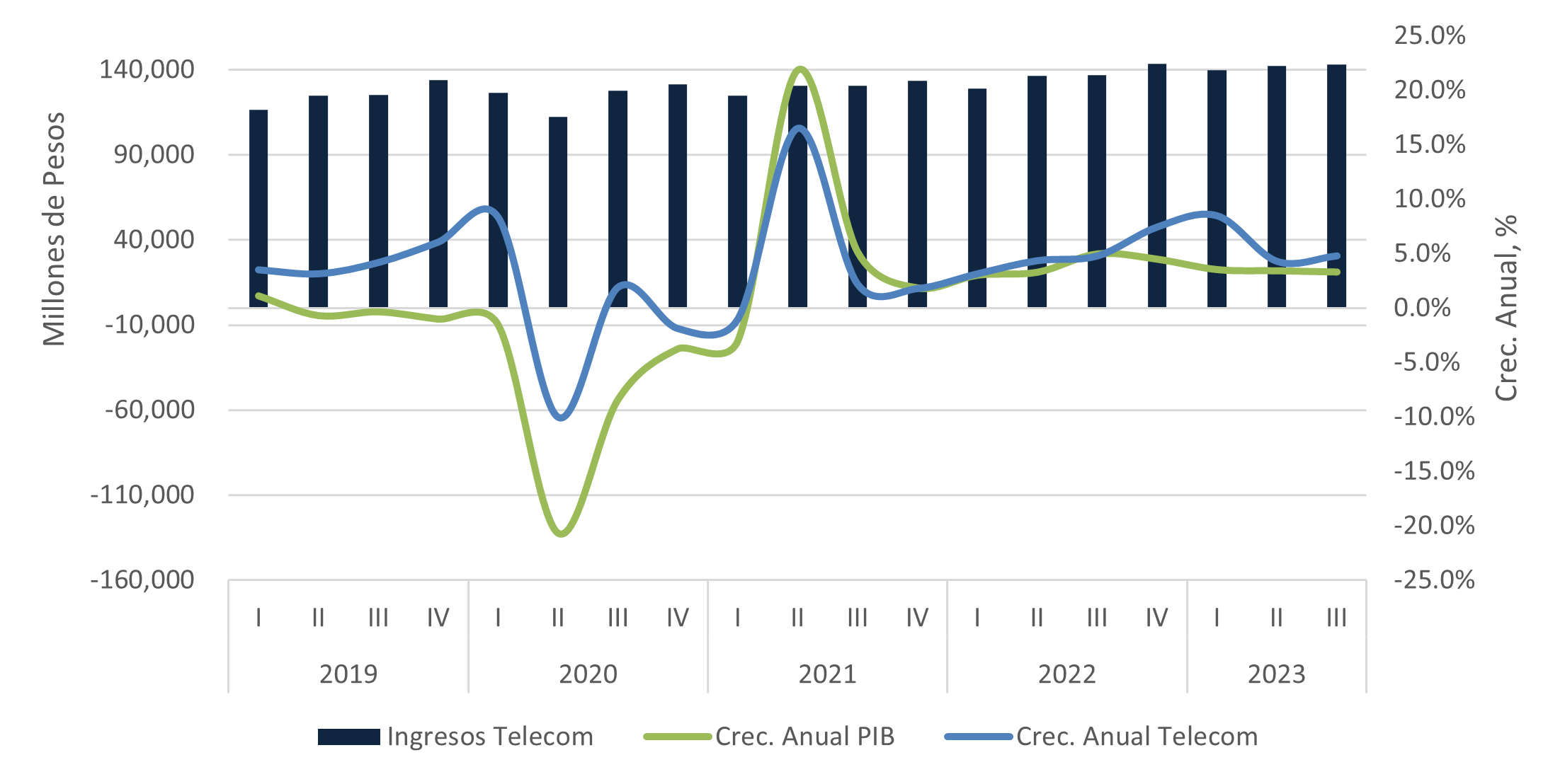| El 2023 llegó al cierre y ha sido un año de claroscuros tanto para la economía mexicana, como para el sector de las telecomunicaciones en su conjunto.Si bien es cierto que el crecimiento económico al cierre del año se vislumbra más alentador, al preverse una tasa de 4.4% en 2023 y de 4.0% para 2024, de acuerdo con la Encuesta sobre las Expectativas de los Especialistas en Economía del Sector Privado realizada por el Banco de México, el dinamismo de la actividad económica aún se encuentra en riesgo ante la baja en la perspectiva de menor actividad económica global.Asimismo, aunque ya en niveles menores que el año previo, la inflación continúa mermando el poder adquisitivo de las personas. Esto último, aunado a las elevadas tasas de interés, el impacto en las exportaciones ante la apreciación del peso, y el entorno geopolítico internacional fracturado, vaticinan una dinámica compleja para 2024.Bajo este contexto amerita analizar la evolución del sector de las telecomunicaciones en México y sus previsiones para el cierre del 2023 y el venidero 2024. Evolución de las Telecomunicaciones en 2023En los últimos años, las telecomunicaciones han demostrado su resiliencia y contraciclicidad/prociclicidad ante los vaivenes macroeconómicos, no siendo el 2023 la diferencia. Así, durante los primeros tres trimestres de 2023, el crecimiento anual acumulado del sector de telecomunicaciones en México fue de 5.8%.En el mismo periodo, el mercado de telecomunicaciones móviles en México alcanzó un crecimiento anual promedio de 7.2%, en términos de ingresos, impulsado en lo principal por la venta de equipos con un crecimiento de 9.5%, mientras que el del componente de servicios fue de 6.0%. Ingresos de Telecomunicaciones y Producto Interno Bruto (Millones de Pesos y Tasa de Crecimiento Anual, %) |