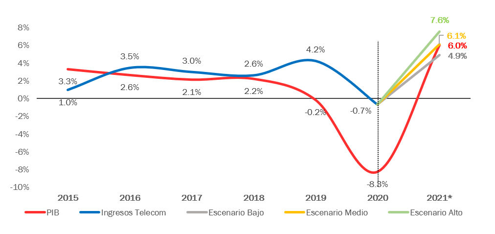 | Fuente: The Competitive Intelligence Unit con información financiera de los operadores Al respecto, si bien durante el trimestre inmediato anterior, el segmento móvil registró un repunte significativo (26.6%) que más que superó la caída registrada en el mismo periodo del año anterior (-18.2%), durante el 3T-2021, el crecimiento anual alcanzó un nivel de 0.2%, con una generación de $75,399 mdp o 57.8% del total sectorial. Este mercado ha sido impactado en su dinámica por la escasez mundial en la oferta de componentes electrónicos que ha causado estragos en la venta de equipamiento móvil en México. La caída de -14.2% en las ventas de estos dispositivos apenas fue compensada con el crecimiento de 8.3% por la comercialización de servicios, circunstancia que explica el escaso incremento en los ingresos del segmento en su conjunto. En lo que toca al mercado de telecomunicaciones fijas, se encuentra en trayectoria de abandonar los números rojos, tal que al 3T-2021, registró un crecimiento anual de -0.3%, al generar ingresos por $23,376 mdp, una ponderación de 17.9% del total sectorial. Este segmento ha sido impulsado por la aceleración en la contratación y uso de internet entre los hogares de México y el creciente carácter esencial de la conectividad, derivados del ‘empujón digital’ causado por la pandemia. Por su parte, el segmento de TV de paga y servicios convergentes continúa registrando su acostumbrada evolución positiva, al registrar un crecimiento anual de 9.3%, con ingresos por $31,609 mdp (24.2% del total sectorial) en el 3T-2021. La creciente preferencia y demanda por la contratación de conectividad convergente para el teletrabajo, la teleducación y el entretenimiento en el hogar, ha provocado que este mercado haya sido el menos impactado en su dinámica al interior del sector de telecomunicaciones. Prospectiva al Cierre de 2021 Tras un año marcadamente recesivo para la economía mexicana que provocó un efecto de arrastre sobre el sector de telecomunicaciones en 2020, se pronostica una recuperación promedio de 6.0% durante 2021, nivel de crecimiento que supera aquel de 2019, en una senda de recuperación. De acuerdo con los pronósticos oportunos elaborados por The Competitive Intelligence Unit (The CIU), en el escenario de menor dinamismo. las telecomunicaciones registrarían un crecimiento de 4.9%, en la proyección media 6.1%, superando así el crecimiento esperado del PIB (6.0%), y en el mejor de los casos sería de 7.6%. En todos, más que se recuperaría la caída observada durante 2020 (-0.7%). La recuperación económica proyectada para 2021, así como el impulso en la adopción en la adopción y consumo de las telecomunicaciones propulsarán el dinamismo sectorial, a un nivel superior al esperado para la economía en su conjunto. Pronósticos 2021: PIB e Ingresos Telecom (Escenarios de Crecimiento) |