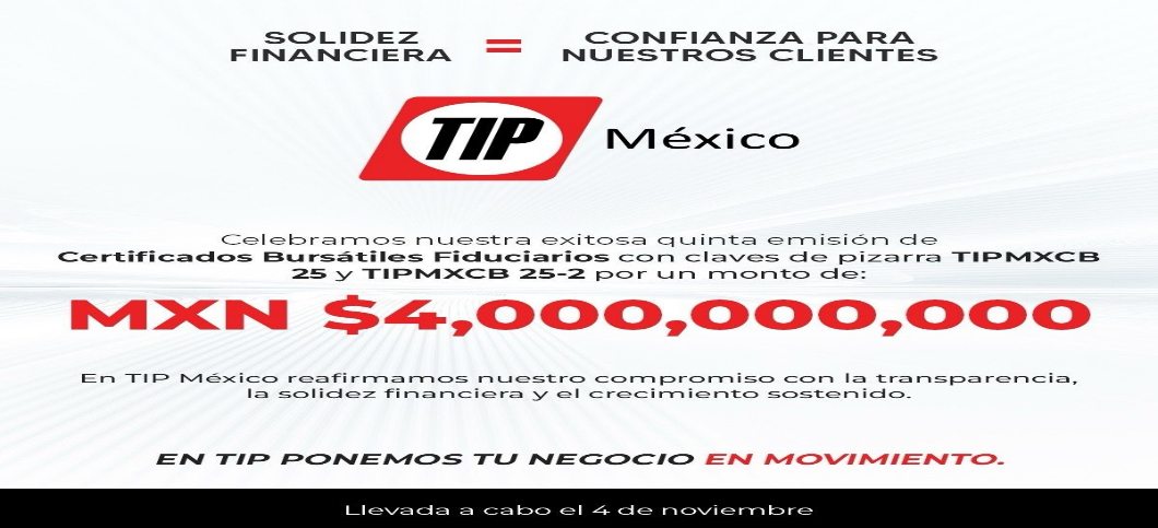 Ciudad de México noviembre de 2025 — TIP México, empresa líder en arrendamiento y administración de flotas, anuncia con orgullo la exitosa colocación de su quinta emisión de Certificados Bursátiles Fiduciarios (CBFs) por un monto total de $4,000 millones de pesos. Esta operación confirma la confianza del mercado en la empresa gracias al continuo crecimiento, la solidez financiera que la caracteriza y la excelencia operativa, además se destaca como una arrendadora líder en México con este tipo de emisiones exitosas por el volumen y demanda en su papel