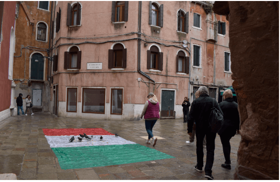 La exposición de las 50 piezas duró dos meses, pero algunas de ellas continúan expuestas hasta el momento en Venecia, ya fuera por petición expresa de los artistas o por sus especificaciones de montaje. Otras fueron exhibidas por tiempo limitado, dependiendo de su naturaleza, las condiciones del espacio, o a petición de los equipos de artistas, y de todas ellas se hizo un registro fotográfico in situ, que junto con la documentación de algunos procesos creativos formará parte de la segunda etapa de LOS INVITADOS, que consistirá en una exposición colectiva en la Ciudad de México, cuyos detalles serán revelados muy pronto.Una de las piezas, por ejemplo, era un tributo de bienvenida -un bolsa de mercado con los colores de las banderas de México e Italia, y con un estampado referente a la participación de LOS INVITADOS y Grupo Máxico en la Bienal, a manera de guiño crítico hacia cómo se maneja el mercado del arte y, al mismo tiempo, para celebrar las similitudes entre ambos países– que el colectivo obsequió al acercarse a las distintas personas para obtener la autorización de exhibición de los diferentes espacios fue en la mayoría de los casos fue bien recibida.“En algunos casos no sabían lo que estábamos haciendo y se quedaban confundidos, mirando como llevábamos a cabo nuestro trabajo. Ahora ya es algo de lo que nos podemos reír, pero también hubo momentos de tensión e incomodidad”, recuerdan con una sonrisa los integrantes de Grupo Máxico