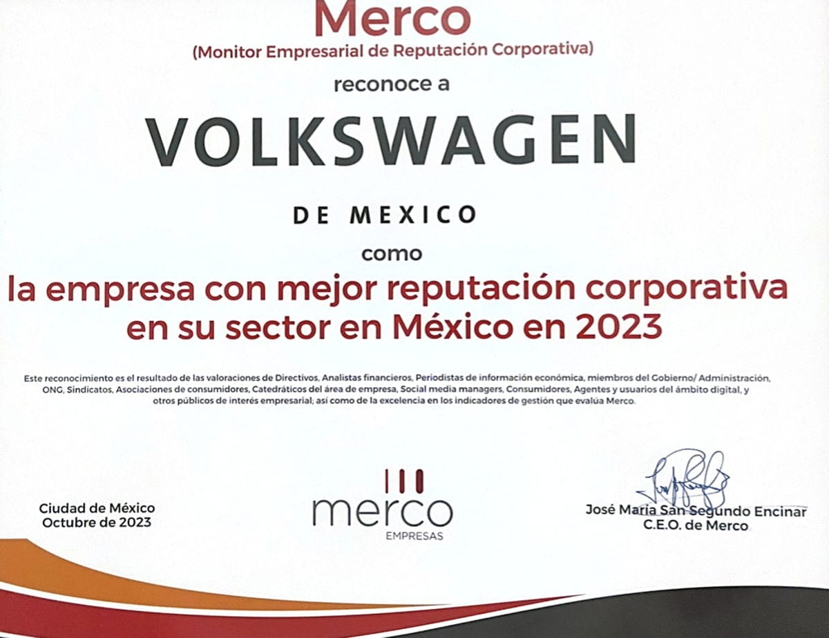 En reconocimiento a su compromiso y desempeño en reputación corporativa Volkswagen de México ha sido distinguida como la empresa con mejor reputación en el sector automotriz dentro de la 11ª edición del Ranking Merco Empresas México 2023. Se trata del primer monitor auditado del mundo y referencia en Iberoamérica, quién evalúa de manera independiente la reputación de las empresas desde hace más de veinte años.